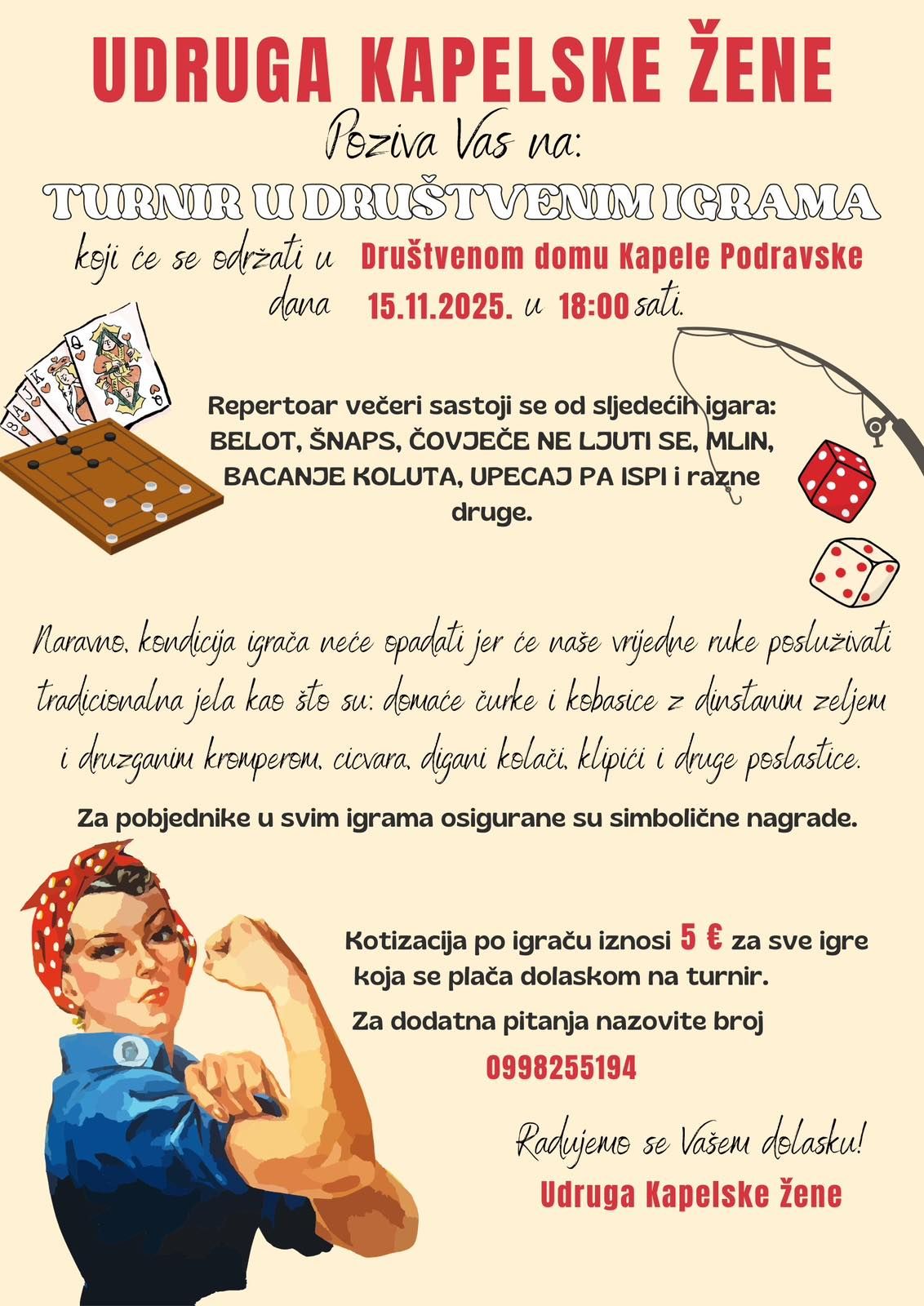 Udruga Kapelske žene najavila je održavanje turnira u društvenim igrama koji će se održati u subotu, 15. studenoga 2025. godine, s početkom u 18 sati, u Društvenom domu Kapele Podravske. Sudionici će se moći okušati u raznim igrama, među kojima su belot, šnaps, „Čovječe, ne ljuti se“, mlin, bacanje koluta i igra „Upecaj pa ispi“, kao i u drugim zabavnim natjecanjima. Tijekom večeri posjetitelji će imati priliku kušati tradicionalna jela koja pripremaju članice udruge, poput domaćih ćurki, kobasica s dinstanim zeljem i krumpirom, cicvara, klipića i drugih slastica. Za pobjednike u svim igrama predviđene su simbolične nagrade, dok kotizacija za sudjelovanje iznosi 5 eura po igraču te se plaća prilikom dolaska na turnir, naveli su iz Udruge Kapelska žena.