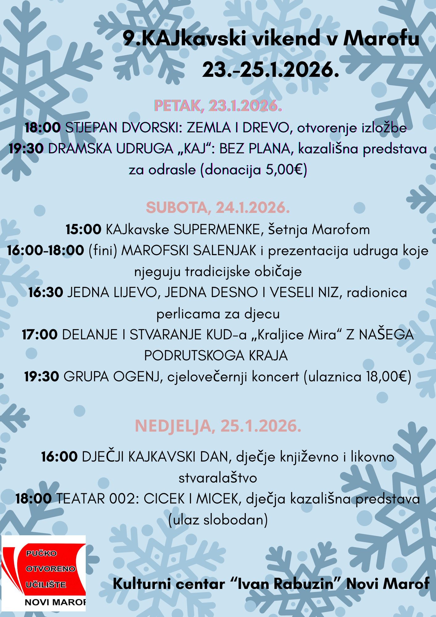 Treći vikend u siječnju rezerviran je za 9.KAJkavski vikend v Marofu, manifestacija čiji je idejni začetnik i provoditelj Pučko otvoreno učilište Novi Marof devetu godinu za redom, a trajat će od 23. do 25. siječnja. Održat će se u Kulturnom centru „Ivan Rabuzin“ Novi Marof te je i ove godine naglasak je na tradiciji i kulturnoj baštini novomarofskog kraja. Donosimo detalje programa u nastavku: