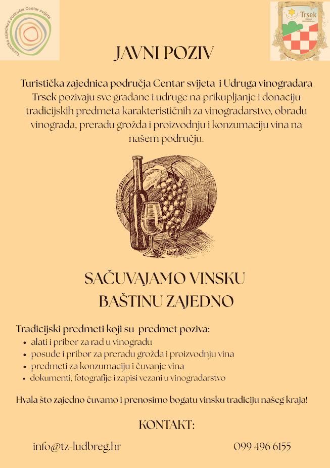 Turistička zajednica područja Centar svijeta i Udruga vinogradara "Trsek" iz Ludbrega pozivaju građane i udruge da se uključe u prikupljanje i donaciju predmeta vezanih uz vinogradarstvo i vinarstvo, navode iz TZ područje Centar Svijeta.