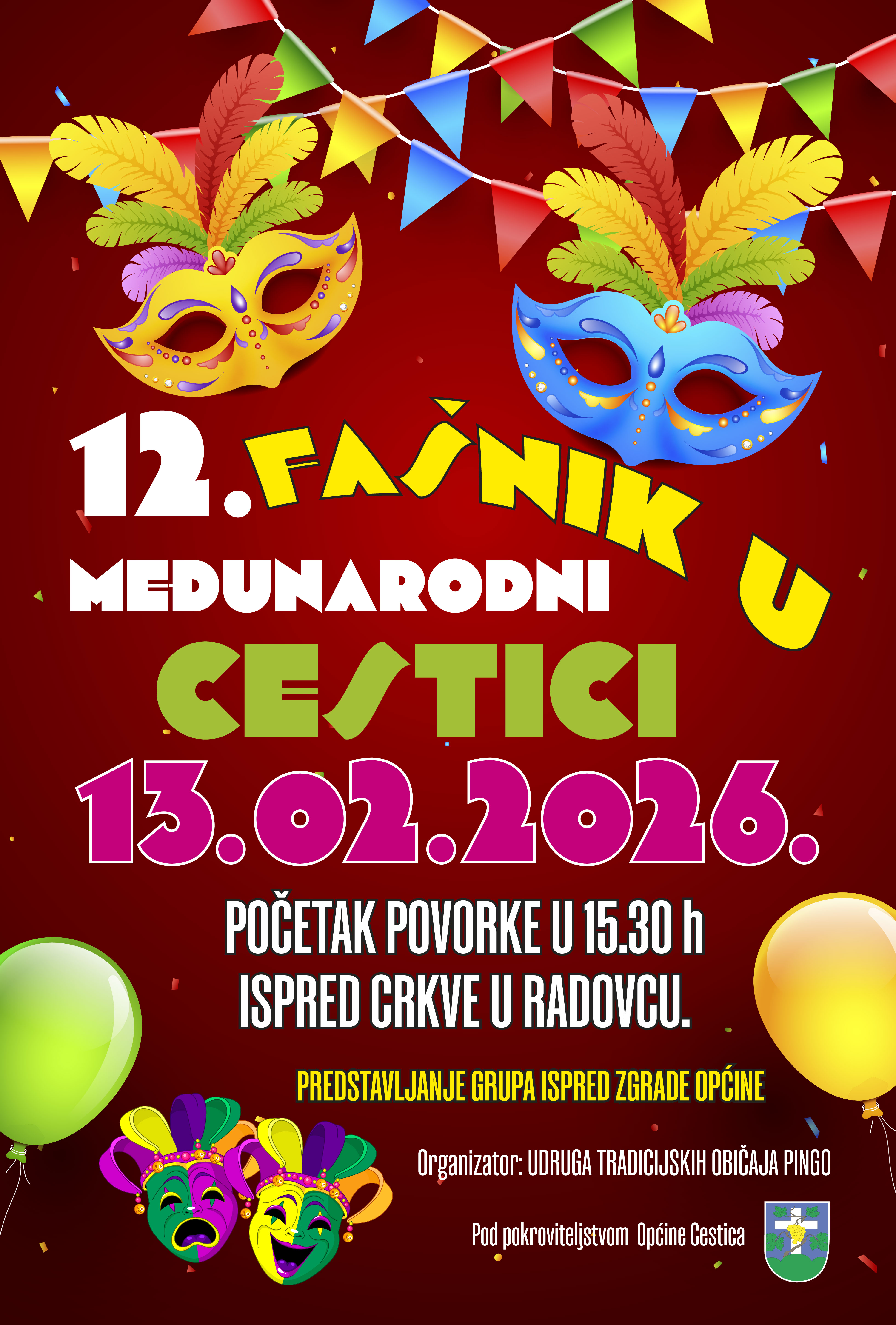 Udruga tradicijskih običaja Pingo i Općina Cestica pozivaju na tradicionalnu međunarodnu fašničku manifestaciju "Fašnik u Cestici", koja će se održati u petak, 13. veljače 2026. godine, izvijestili su iz Općine Cestica.