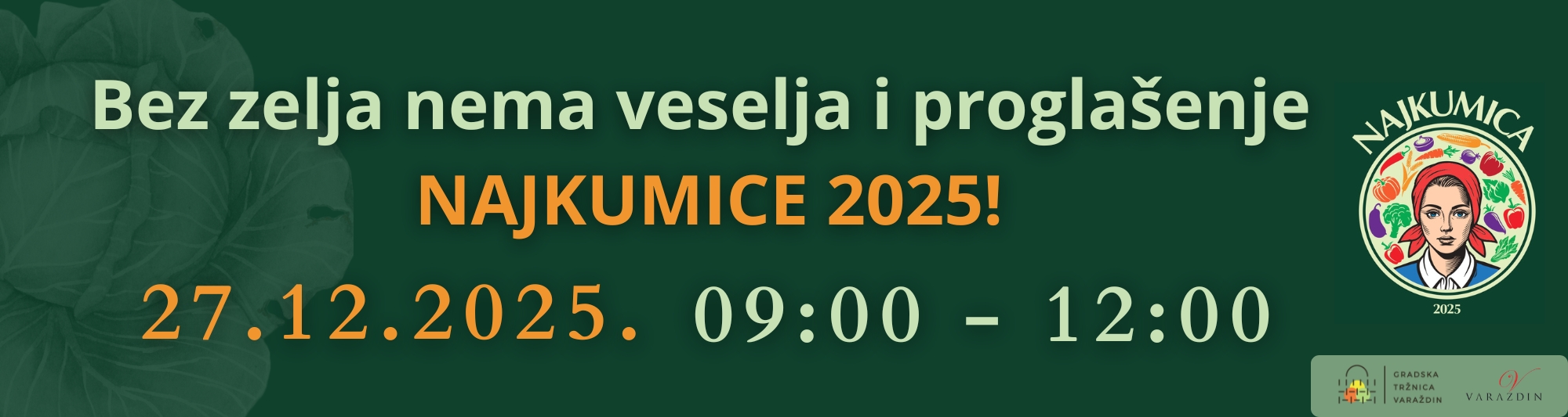 Varaždinski plac u subotu, 27. prosinca 2025., od 09:00 do 12:00 sati ponovno će postati središte tradicije, domaćih okusa i dobro poznate topline na događanju „Bez zelja nema veselja i odabir Najkumice 2025“. Ovo posebno subotnje druženje slavi varaždinsko zelje i ulogu naših kumica, žena koje svojim radom, osmijehom i predanošću svakodnevno čuvaju duh i autentičnost varaždinskog placa.